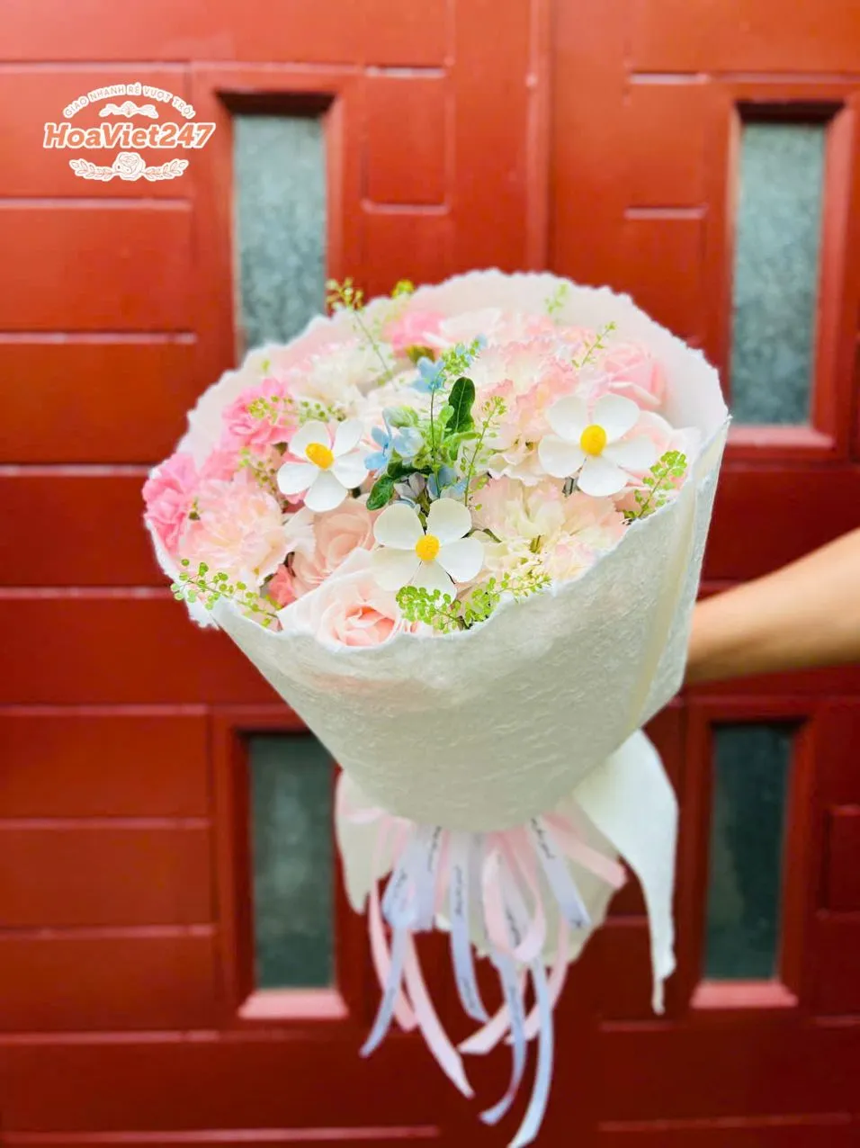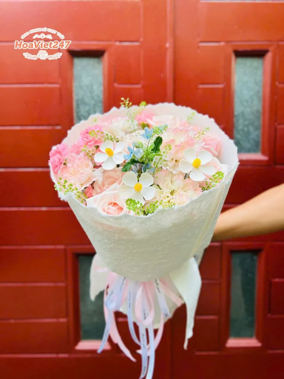 Bó Hoa Sinh Nhật Nhẹ Nhàng BH134 được thiết kế theo phong cách tinh giản nhưng thanh lịch, kết hợp những gam màu mềm mại như hồng pastel – trắng tạo cảm giác trong trẻo và dịu mát. Từng bông hoa được sắp đặt khéo léo để mang đến tổng thể hài hòa, ngọt ngào nhưng không kém phần sang trọng.